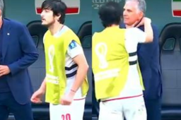 【01:05:00】 北京时间11月25日,世界杯小组赛B组第2轮,伊朗队补时阶段连下两城,2-0击败威尔士。伊朗队前锋阿兹蒙激动地掐主教练奎罗斯的脖子庆祝。
