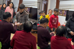 【02:05:00】 1月20日,福建泉州,家庭聚会上爷爷奶奶给孙辈发红包贺新年。家属称,以前每个孩子的红包是5000元,老人说今年就再大方一点。
