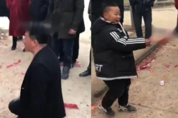 【20:05:00】 1月22日,河南商丘永城。40岁男子给8岁小朋友磕头拜年,拍摄者:大人应该叫小孩爷爷,10块20块随便给。