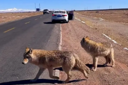 【20:05:00】 2月26日,青海一男子自驾游遇两匹狼,将车停路边休息拍照。前车女子将狼误认成狗,准备下车拍照,男子连忙制止提醒大喊:这是狼啊。