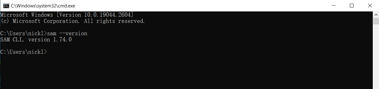 安装成功后cmd输入sam –version出现如下界面即表示安装成功