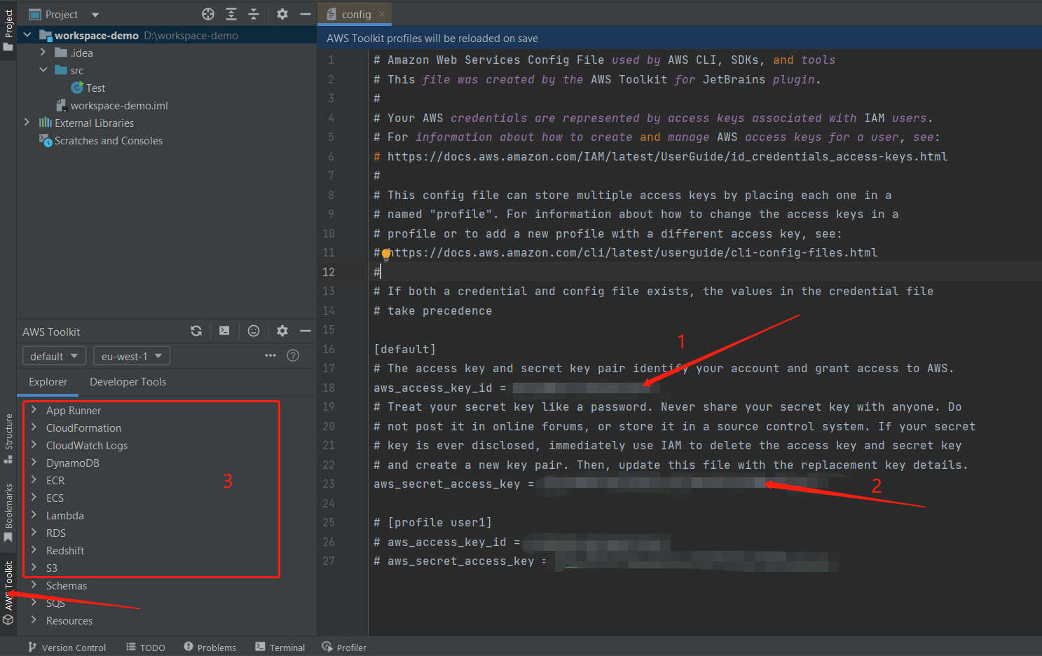 然后进行填入获取到的aws_access_key_id和aws_secret_access_key如下