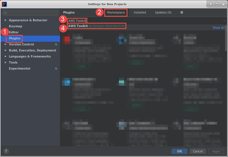在Marketplace选项卡上的Search plugins in marketplace中,开始输入AWS Toolkit