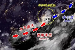 【13:05:00】 台风“海葵”虽已停编,但其残余低压一直“消而不散”。主要原因是,海葵残余低压受到季风的支援,并在冷平流配合下,激发出的雨带出现“列车效应”。
