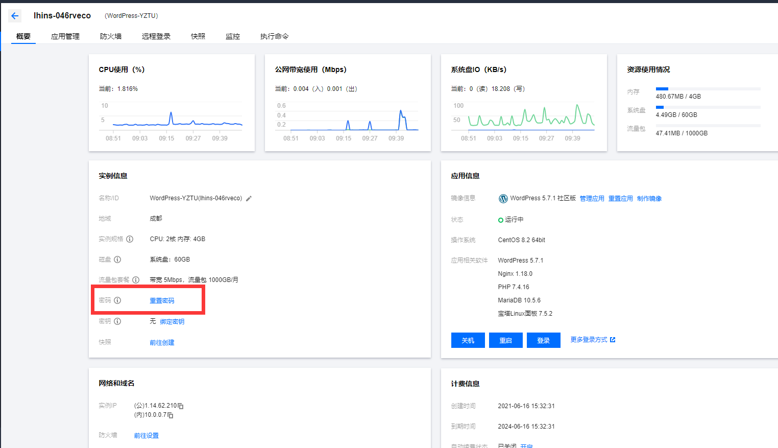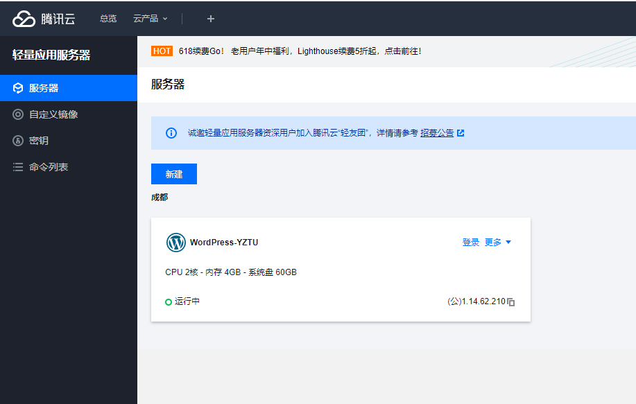 配置好后进入腾讯云控制台就可以看到这台服务器的情况