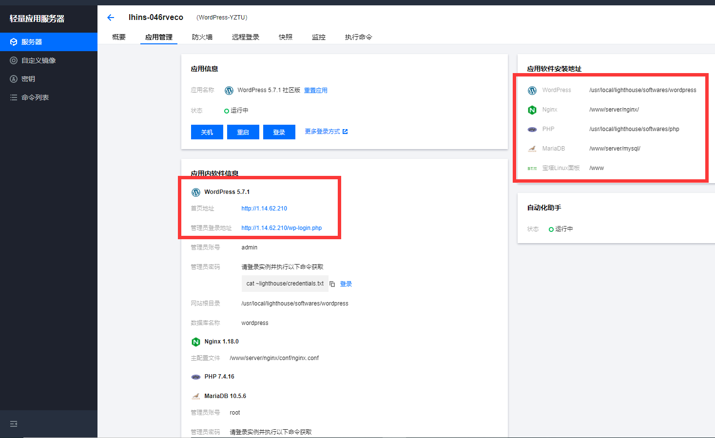 可以看到默认就带了wordpress,可以直接访问ip就能打开首页.另外在应用管理页面可以看到我们服务器上默认给我安装的应用的相关信息